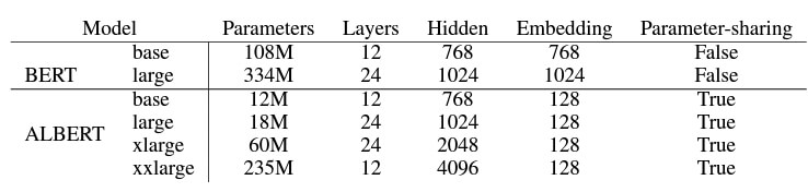 - BERT와 ALBERT의 파라미터를 비교한 표